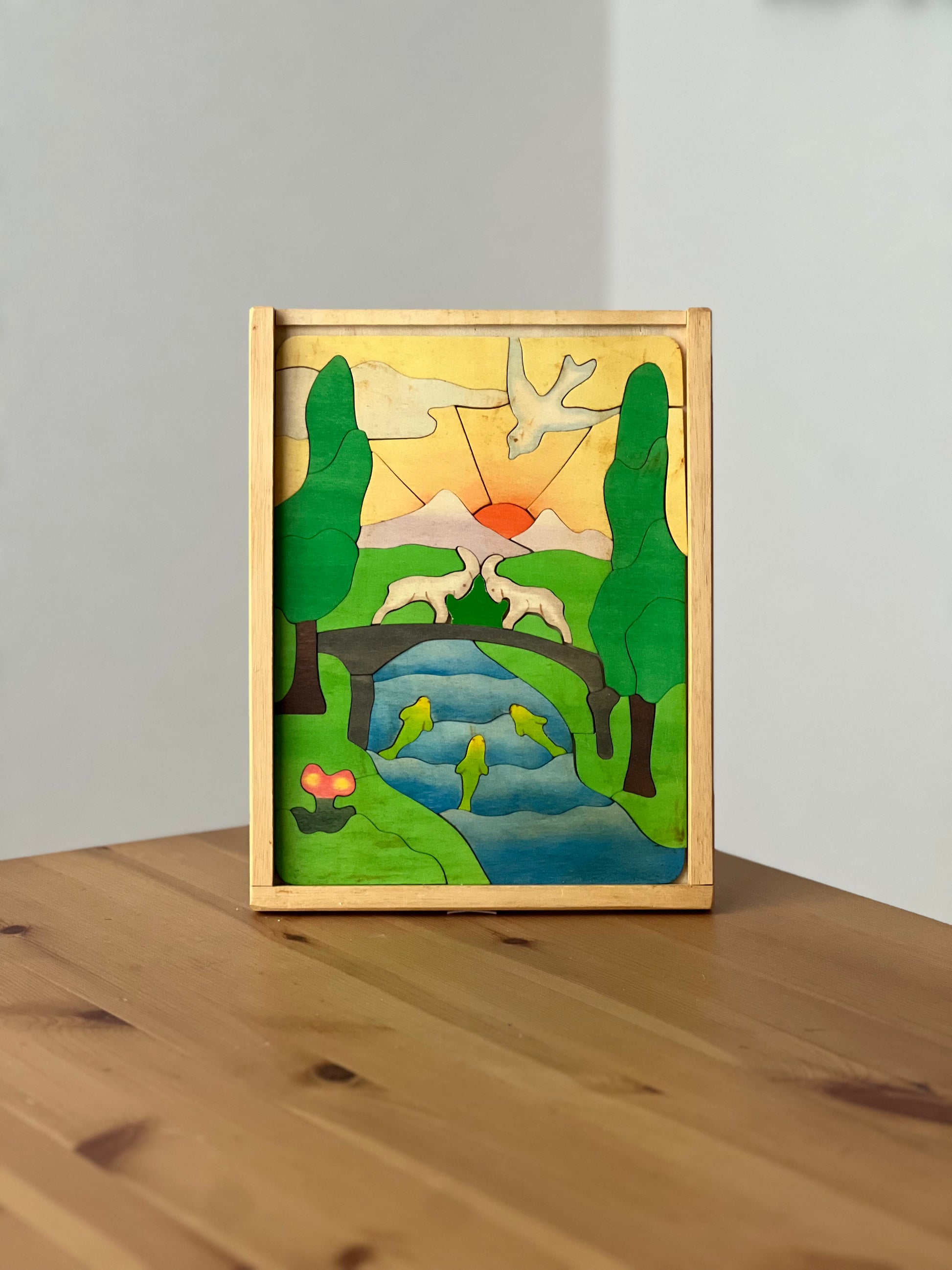 朝日が登り、魚が川を泳ぎ、緑豊かな山がデザインされています